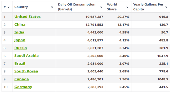 Global crude oil demand is concentrated among a few large economies. The United States is the world’s largest oil consumer, with demand driven primarily by road transport, aviation, and petrochemicals. China follows, supported by manufacturing activity, freight movement, and a steadily expanding middle class. India is among the fastest-growing oil consumers, as urbanisation, rising vehicle penetration, and infrastructure development continue to lift demand. Other major consuming regions include Europe, Japan, and the Middle East, where oil usage reflects a combination of industrial needs, transportation patterns, and national energy policies.
