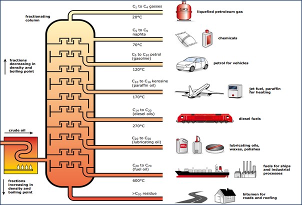 Refineries process crude oil through distillation and chemical conversion to produce different forms: