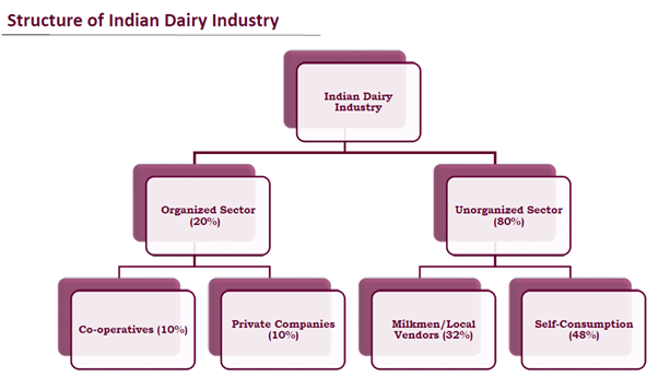 The organised sector handles roughly 20 percent of milk, while around 80 percent flows through unorganised channels, including local vendors and self‑consumption (Source: CARE Indian Dairy Industry Report; Brickwork Ratings).