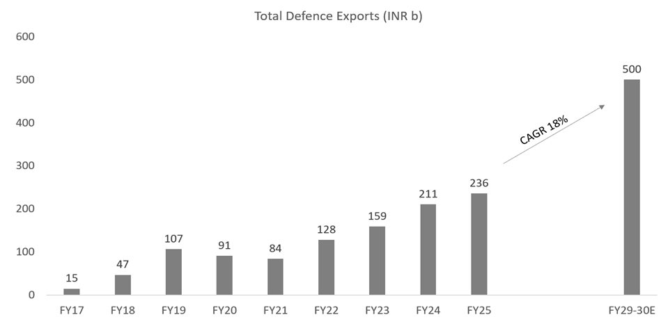 Rising global geopolitical tensions have triggered a sustained increase in defence spending across developed economies, particularly among NATO members, many of whom are accelerating re‑armament and replenishing depleted inventories of ammunition, missiles and electronic systems. NATO’s renewed focus on higher defence allocations and supply‑chain diversification is expanding demand for reliable, cost‑competitive suppliers beyond traditional Western OEMs. This global re‑stocking cycle is creating a meaningful export opportunity for India, especially in areas such as missiles, ammunition, radars, electronic warfare and subsystems, where domestic capabilities have matured and delivery timelines are increasingly competitive. As global defence spending remains structurally elevated, external demand is emerging as a durable second engine of growth for India’s defence manufacturing ecosystem.