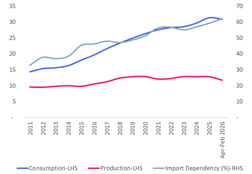 Moreover, LPG consumption has risen steadily over time, while domestic production has remained broadly flat, pushing import dependency above 60%.