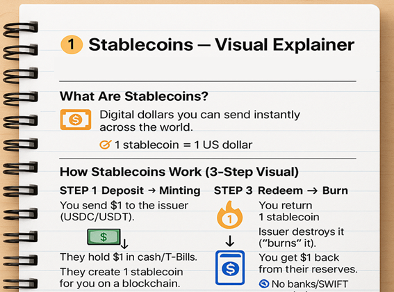 Stablecoins are cryptocurrencies designed to hold a stable value, usually pegged 1:1 to a fiat currency like the US Dollar. Think of them as a digital currency on the blockchain. Their core purpose is to solve crypto’s biggest problem: volatility. Unlike Bitcoin or Ether, which can swing 10–20% in a day, stablecoins stay near $1 and thus act as a reliable medium of exchange, settlement asset and store of value.