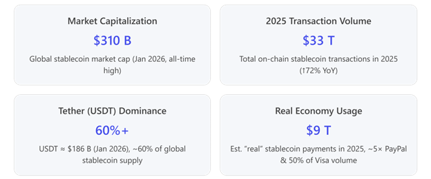In 2025, stablecoins quietly rewrote the rules of global money movement. They processed an astonishing $33 trillion worth of transactions in 2025 which is more than Visa & Mastercard combined.