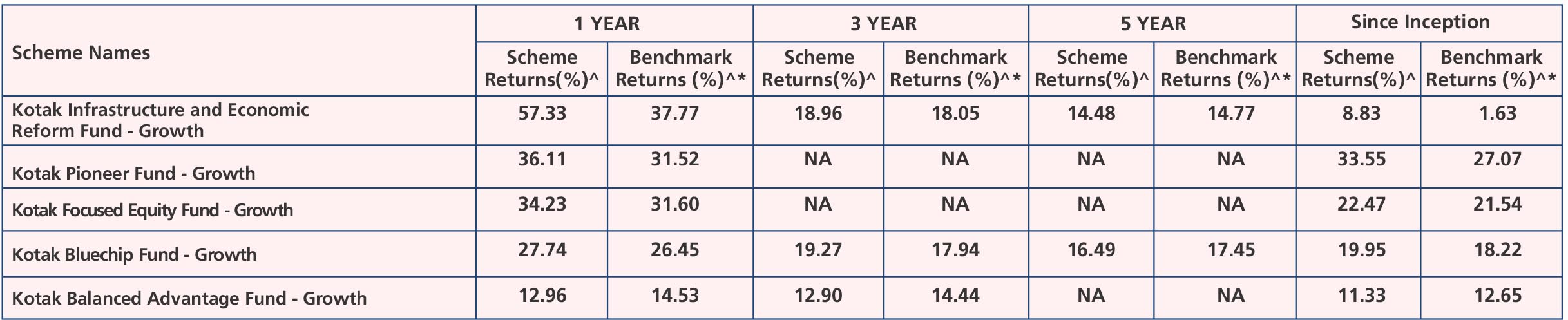 Kotak Bluechip Fund (Feb 04, '03), Kotak Infrastructure & Economic Reform Fund (Feb 25, '08), Kotak Balanced Advantage Fund (Aug. 03,'18), Kotak Focused Equity fund (Jul 16, '19), Kotak Pioneer Fund (Oct