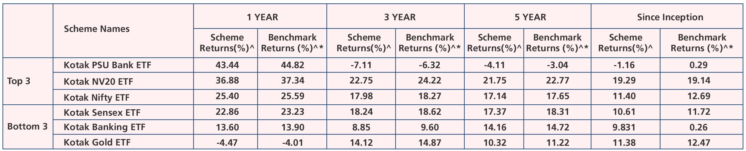 Kotak NV20 ETF (Dec. 1, '15), Kotak Banking ETF (Dec. 10, '14), Kotak Sensex ETF (Jun. 06, '08), Kotak Nifty ETF (Feb. 02, '10), Kotak PSU Bank ETF (Nov. 08, '07), Kotak Gold ETF