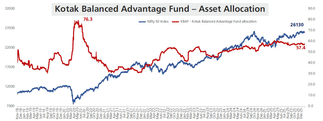 Source: KMAMC Internal Analysis. As on 31st December 2025. Disclaimer: The Nifty 50 Index exposure is considered to explain the equity valuations as category in comparison to KBAF Allocation. | KBAF - Kotak Balanced Advantage Fund. Nifty 50 Index represents the Market which is 50% component of the Benchmark – Nifty 50 Hybrid Composite Debt 50:50 Index.