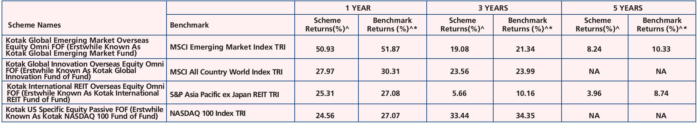 (Aug. 03' 18), Kotak US Specific Equity Passive FOF (Erstwhile Known As Kotak NASDAQ 100 Fund of Fund) (Feb. 02' 21), Kotak Multicap Fund (Sep. 29'21), Kotak NIFTY Alpha 50 ETF (Dec. 22'21), Kotak NIFTY 50 Index Fund (Jun. 21'21),