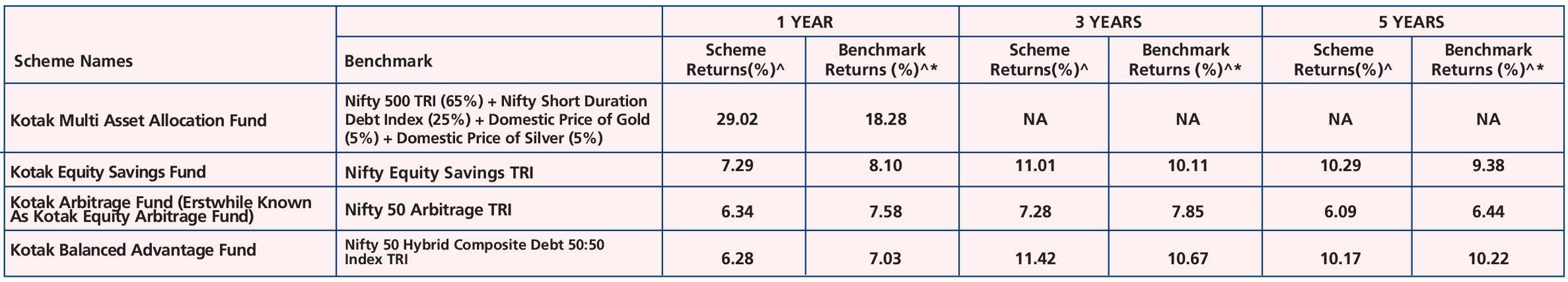 Kotak Multi Asset Allocation Fund - Growth, *Name of the Benchmark - Nifty 500 TRI (65%) + Nifty Short Duration Debt Index (25%) + Domestic Price of Gold (5%) + Domestic Price of Silver (5%). Scheme