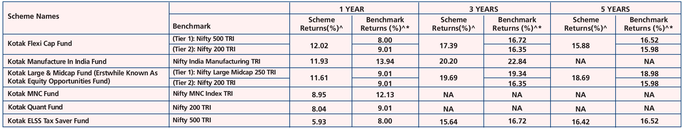 Kotak ELSS Tax Saver Fund (Nov. 23,'05), Kotak Large & Midcap Fund (Erstwhile Known As Kotak Equity Opportunities Fund) (Sep 9, ‘04), Kotak Flexicap Fund (Sep 11, ‘09), Kotak Manufacture in India Fund (Feb. 22,'22), Kotak