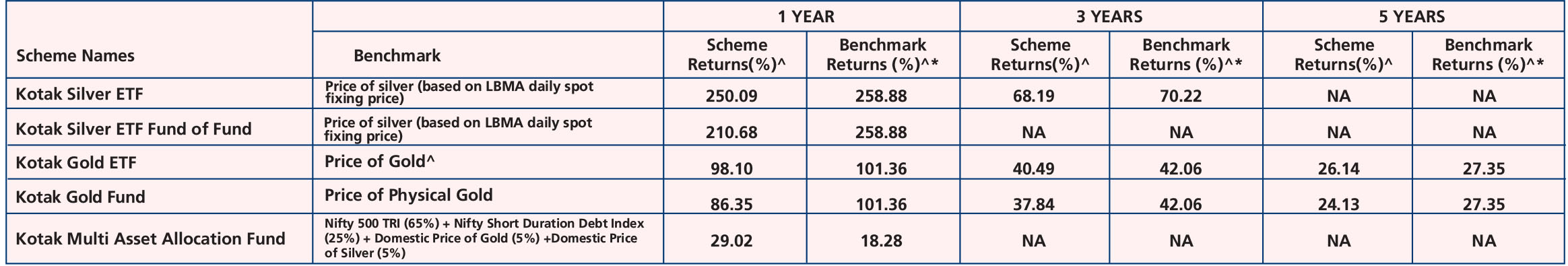 Kotak Gold ETF (Jul. 27, ’07), Kotak Gold Fund (Mar. 25, ’11), Kotak Silver ETF (Dec. 09, ’22), Kotak Silver ETF Fund Of Fund (Mar. 31, ‘23) & Kotak Multi Asset Allocation Fund (Sep. 22, ‘23).