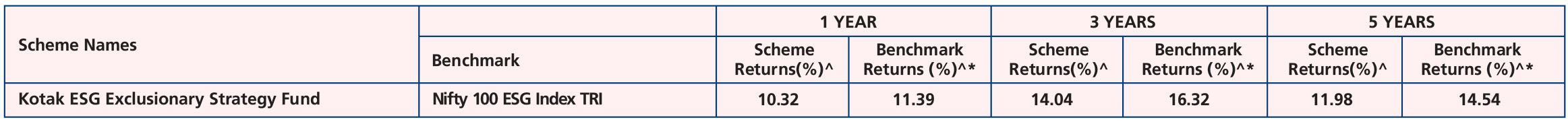 Kotak ESG Exclusionary Strategy Fund - Growth, *Name of the Benchmark - Nifty 100 ESG Index TRI, Scheme Inception date is 11/12/2020. Mr. Mandar Pawar has been managing the scheme since 22/1/2024
