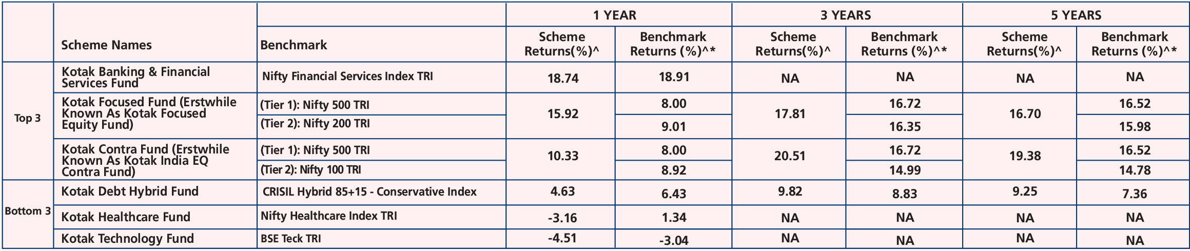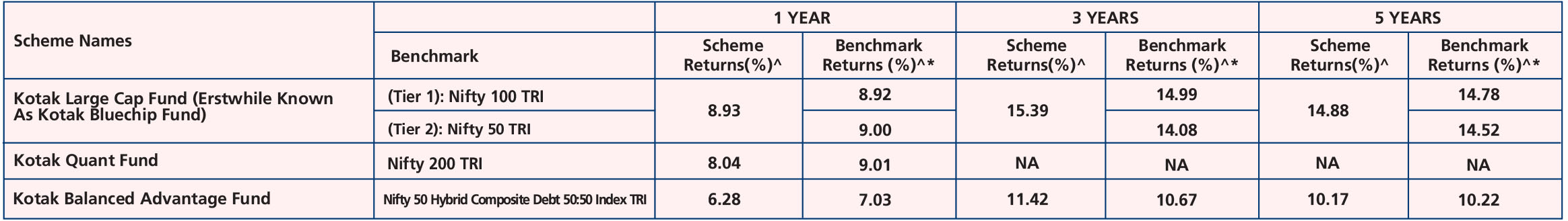 Kotak Large Cap Fund (Erstwhile Known As Kotak Bluechip Fund) (Dec. 29,'98), Kotak Balanced Advantage Fund (Aug. 3,'18),Kotak Quant Fund (Aug. 2,'23), Kotak Active Momentum Fund (Aug.