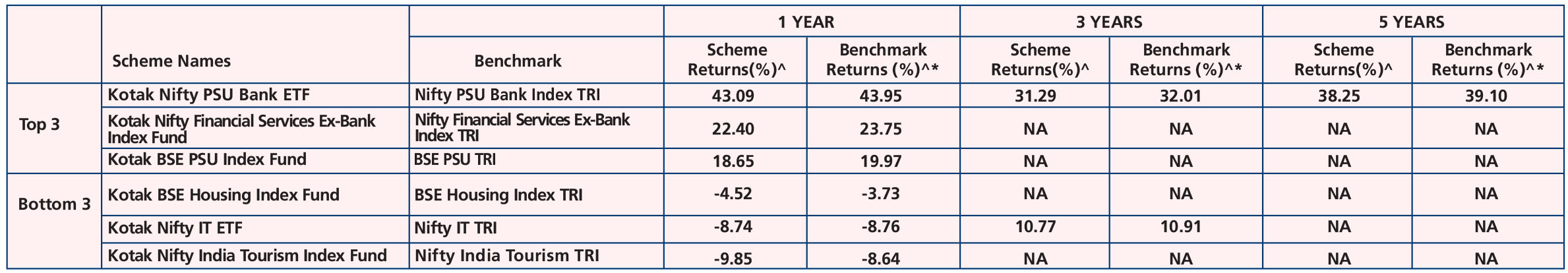 '04), Kotak Nifty PSU Bank ETF (Nov. 08, 07), Kotak Nifty 50 ETF (Feb. 02, '10), Kotak Nifty IT ETF (Mar. 02, '21), Kotak NIFTY 50 Index Fund (Jun. 21, '21), Kotak NIFTY Next 50 Index (Mar. 10, '21),