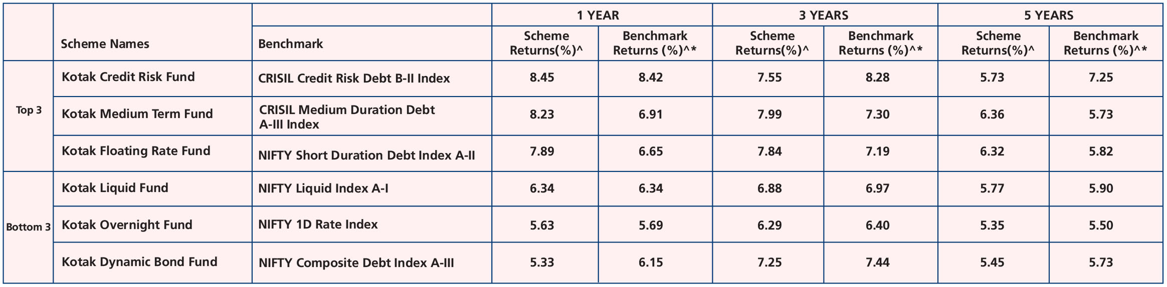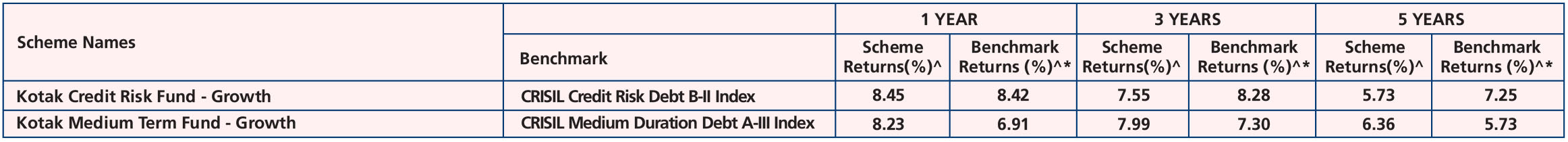 Fund (Dec. 29, ’98), Kotak Savings Fund (Aug. 13, ’04), Kotak Credit Risk Fund (May 11, '10), Kotak Medium Term Fund (Mar. 21, ’14), Kotak Low Duration Fund (Mar. 06, ’08), Kotak Corporate