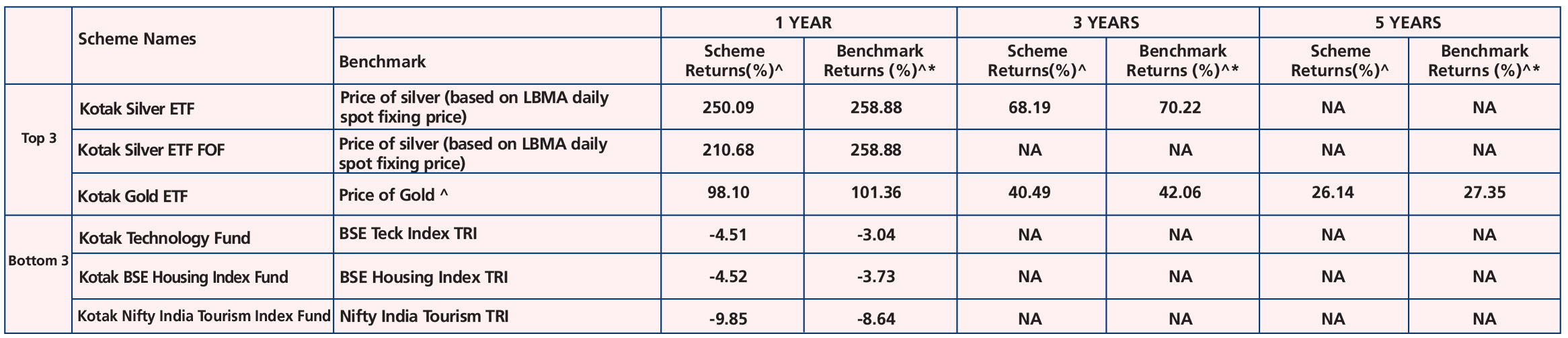 Kotak Silver ETF - *Name of the Benchmark- Price of silver (based on LBMA daily spot fixing price), Scheme Inception date is 09/12/2022. Mr. Jeetu Valechha Sonar & Mr. Abhishek Bisen have been managing the fund since 09/12/2022.