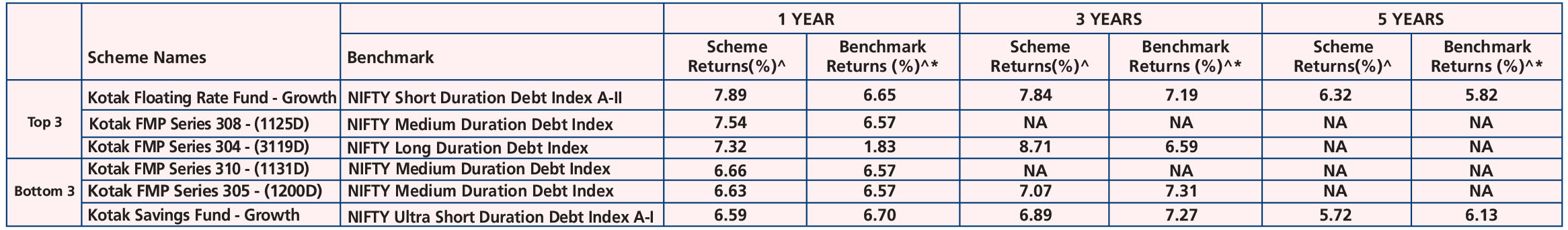Kotak Savings Fund (Aug. 13, ’04), Kotak Money Market Fund (Jul. 14, ‘03), Kotak Corporate Bond Fund (Sep. 21, ‘07), Kotak Floating Rate Fund (May. 14, ‘19), Kotak Crisil IBX financial