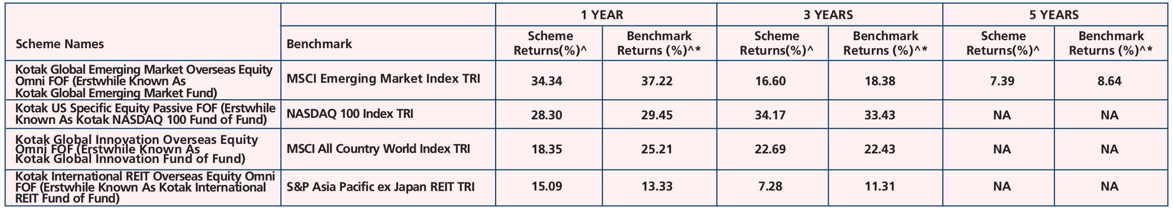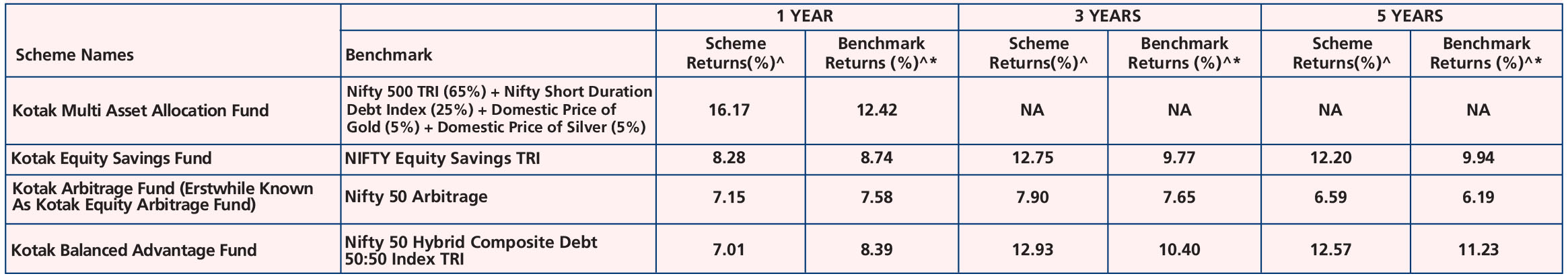 Kotak Equity Savings Fund (Oct. 13, '14), Kotak Gold Fund (Mar. 25, ’11), Kotak Multi Asset Omni FOF (Erstwhile Known As Kotak Multi Asset Allocator Fund of Fund - Dynamic) (Aug. 09, ’04), Kotak Gold ETF (Jul. 27, ’07), Kotak