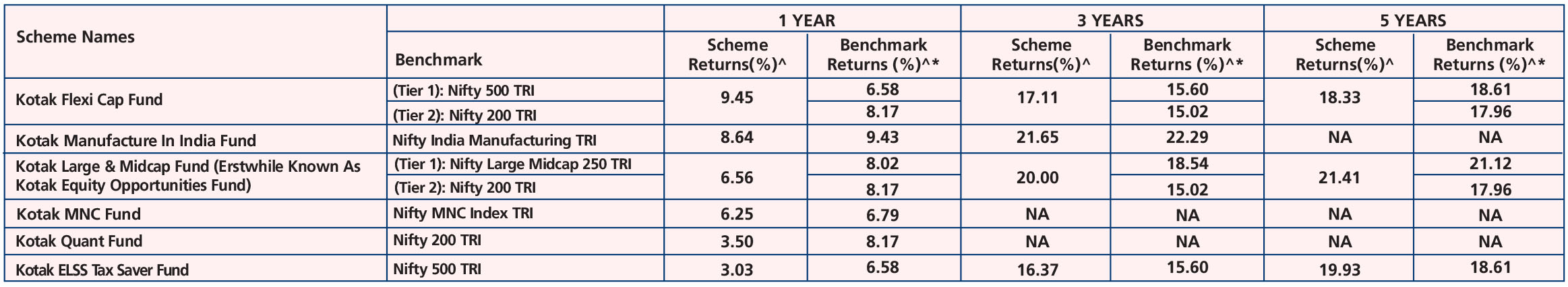 Kotak ELSS Tax Saver Fund (Nov. 23,'05), Kotak Large & Midcap Fund (Erstwhile Known As Kotak Equity Opportunities Fund) (Sep 9, ‘04), Kotak Flexicap Fund (Sep 11, ‘09), Kotak Manufacture in India Fund (Feb. 22,'22), Kotak