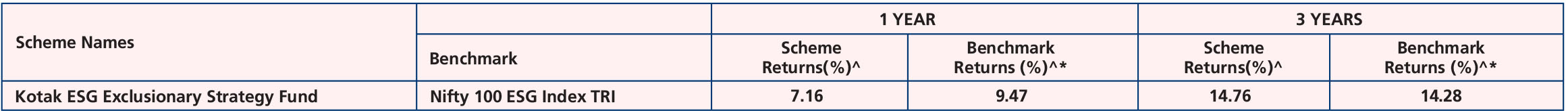 Kotak ESG Exclusionary Strategy Fund - Growth, *Name of the Benchmark - Nifty 100 ESG Index TRI, Scheme Inception date is 11/12/2020. Mr. Mandar Pawar has been managing the scheme since 22/1/2024
