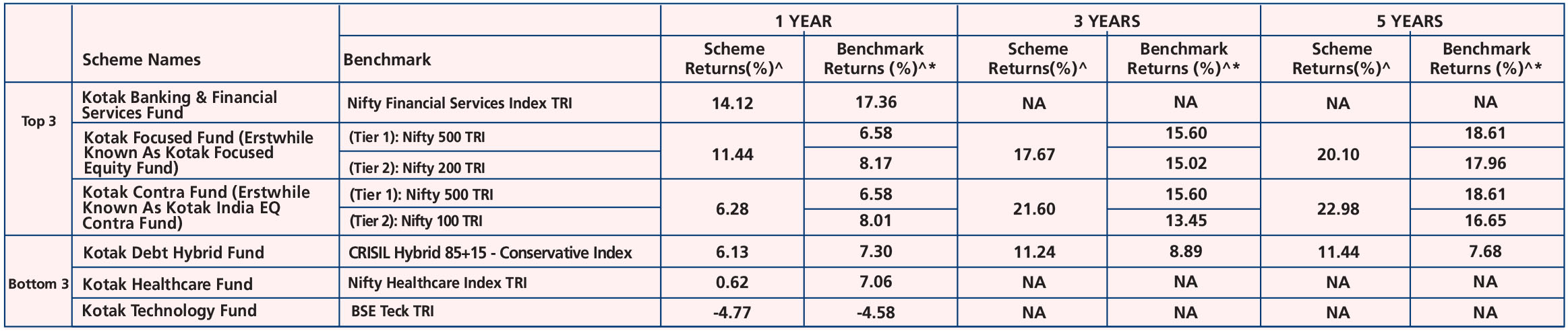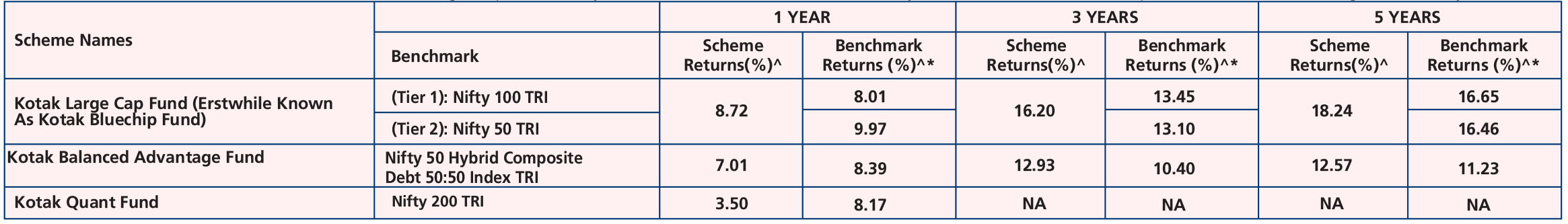 Kotak Large Cap Fund (Erstwhile Known As Kotak Bluechip Fund) (Dec. 29,'98), Kotak Balanced Advantage Fund (Aug. 3,'18), Kotak Quant Fund (Aug. 2,'23), Kotak Active Momentum Fund (Aug.