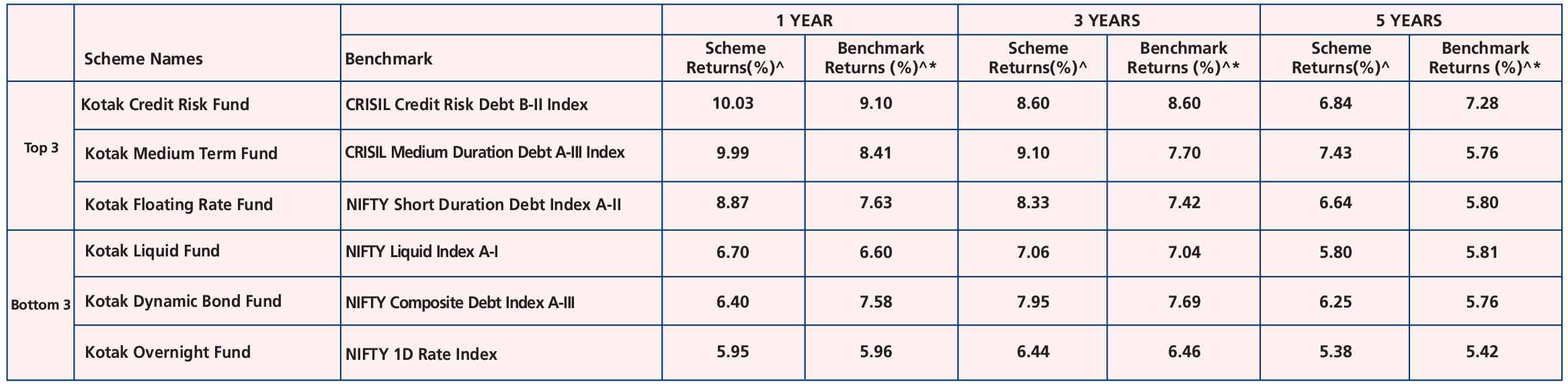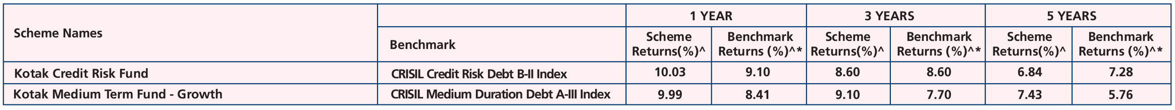 Fund (Dec. 29, ’98), Kotak Savings Fund (Aug. 13, ’04), Kotak Credit Risk Fund (May 11, '10), Kotak Medium Term Fund (Mar. 21, ’14), Kotak Low Duration Fund (Mar. 06, ’08), Kotak Corporate