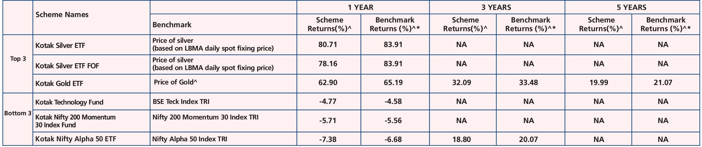 Kotak Silver ETF - *Name of the Benchmark- Price of silver (based on LBMA daily spot fixing price), Scheme Inception date is 09/12/2022. Mr. Jeetu Valechha Sonar & Mr. Abhishek Bisen have been managing the fund since 09/12/2022.