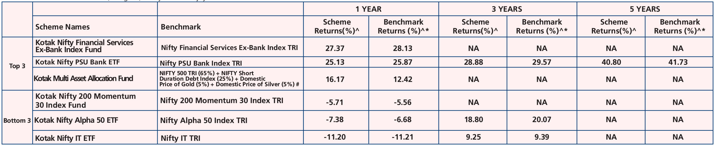 Transportation & Logistics Fund (Dec. 16, ‘24), Kotak Nifty Smallcap 250 Index Fund (Jan. 27, ‘25), Kotak CRISIL-IBX AAA Bond Financial Services Index-Dec 2026 Fund (Feb. 17, ‘25), Kotak MSCI India ETF (Feb. 19, ‘25), Kotak Nifty 100