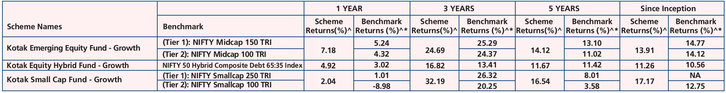 Kotak Small Cap Fund (Feb. 24,'05), Kotak Emerging Equity Fund (Mar 30,'07), Kotak Equity Hybrid Fund (Nov. 25,'99) & Kotak Business Cycle Fund (Sep. 28,'22).