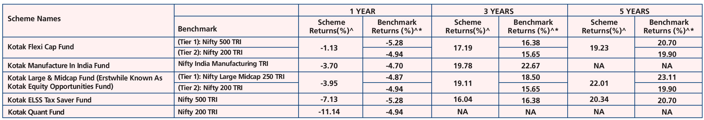Kotak ELSS Tax Saver Fund (Nov. 23,'05), Kotak Large & Midcap Fund (Erstwhile Known As Kotak Equity Opportunities Fund) (Sep 9, ‘04), Kotak Flexicap Fund (Sep 11, ‘09), Kotak Manufacture in India Fund (Feb. 22,'22), Kotak