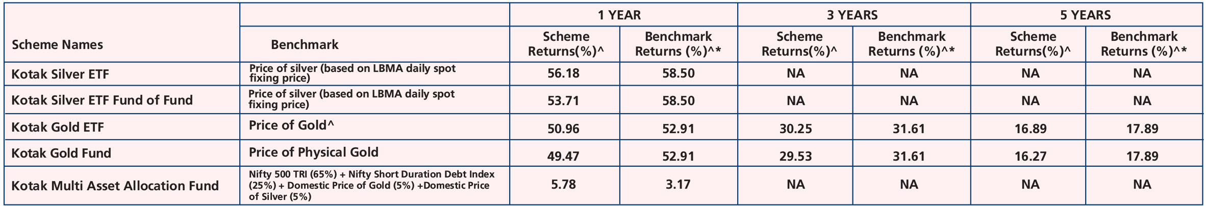 Kotak Silver ETF - *Name of the Benchmark- Price of silver (based on LBMA daily spot fixing price), Scheme Inception date is 09/12/2022. Mr. Jeetu Valechha Sonar & Mr. Abhishek Bisen have been managing the fund since 09/12/2022.