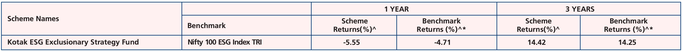 Kotak ESG Exclusionary Strategy Fund - Growth, *Name of the Benchmark - Nifty 100 ESG Index TRI, Scheme Inception date is 11/12/2020. Mr. Mandar Pawar has been managing the scheme since 22/1/2024