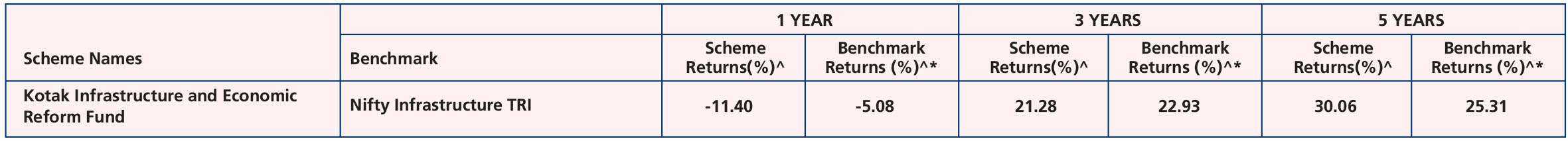 Kotak Infrastructure and Economic Reform Fund - Growth, *Name of the Benchmark - Nifty Infrastructure TRI, Scheme Inception date is 25/02/2008. Mr. Nalin Rasik Bhatt has been managing the fund since 01/10/2023.