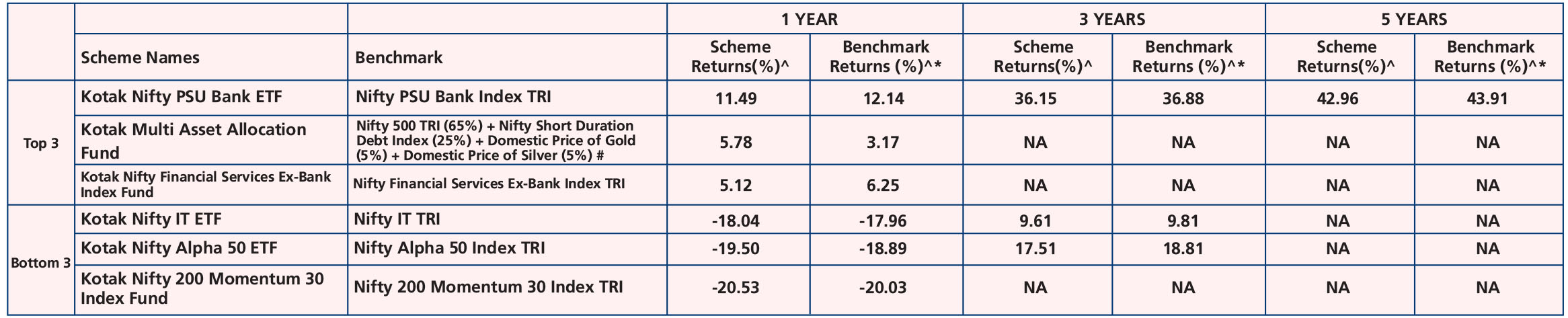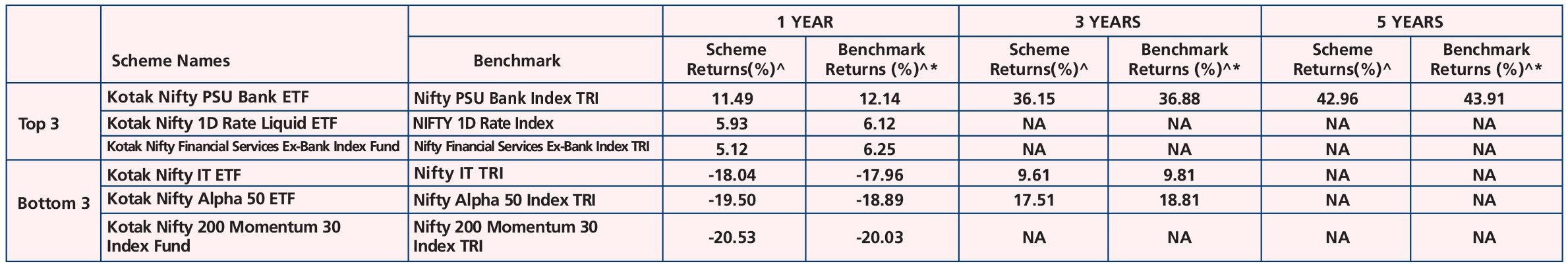 '04), Kotak Nifty PSU Bank ETF (Nov. 08, 07), Kotak Nifty 50 ETF (Feb. 02, '10), Kotak Nifty IT ETF (Mar. 02, '21), Kotak NIFTY 50 Index Fund (Jun. 21, '21), Kotak NIFTY Next 50 Index (Mar. 10, '21),