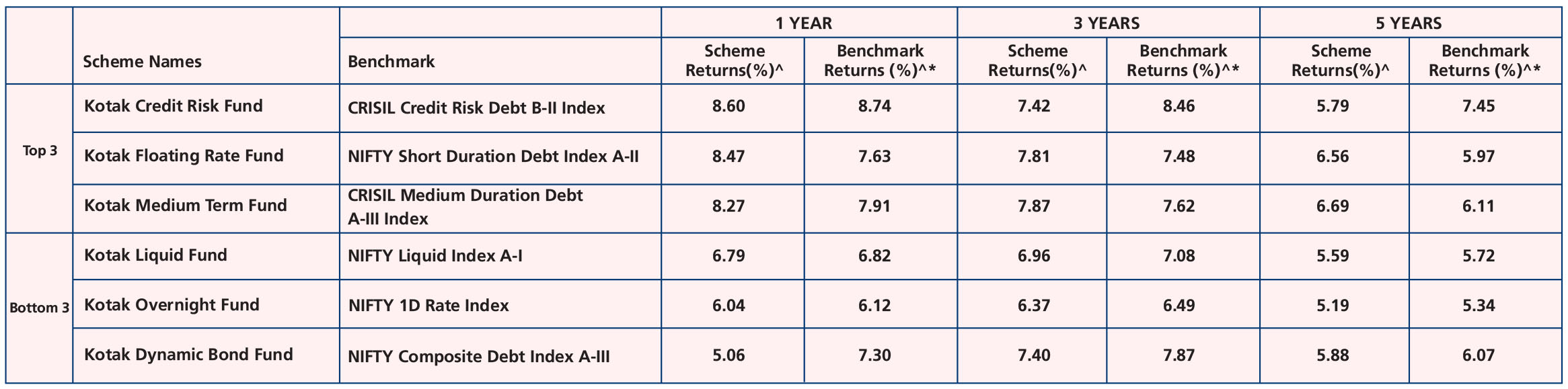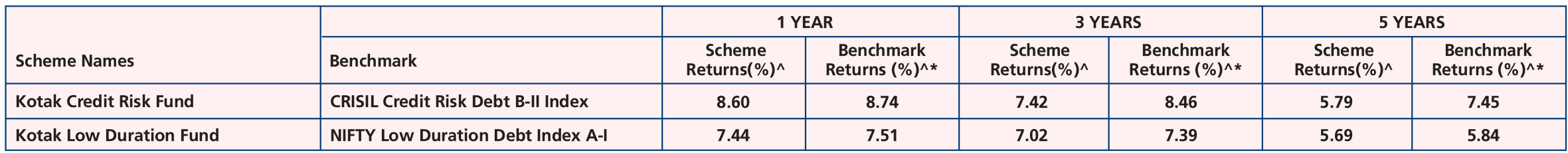 Fund (Dec. 29, ’98), Kotak Savings Fund (Aug. 13, ’04), Kotak Credit Risk Fund (May 11, '10), Kotak Medium Term Fund (Mar. 21, ’14), Kotak Low Duration Fund (Mar. 06, ’08), Kotak Corporate