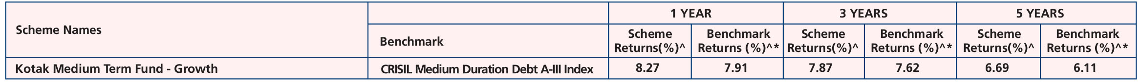 Kotak Medium Term Fund - Growth, *Name of the Benchmark - CRISIL Medium Duration Debt A-III Index, Scheme Inception date is 21/03/2014. Mr. Deepak Agrawal has been managing the fund since