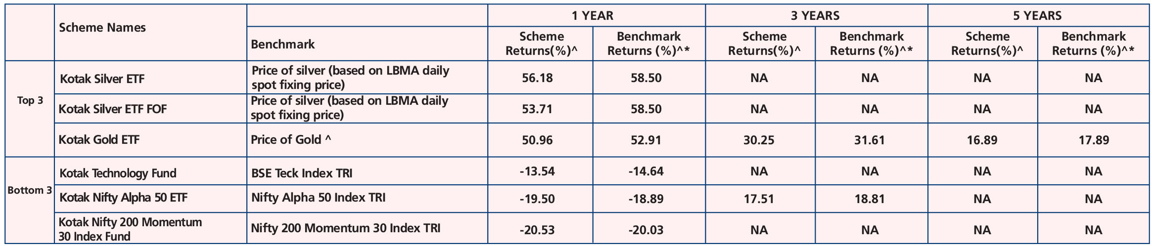 Kotak Gold ETF (Jul. 27, ’07), Kotak Gold Fund (Mar. 25, ’11), Kotak Silver ETF (Dec. 09, ’22), Kotak Silver ETF Fund Of Fund (Mar. 31, ‘23) & Kotak Multi Asset Allocation Fund (Sep. 22, ‘23).