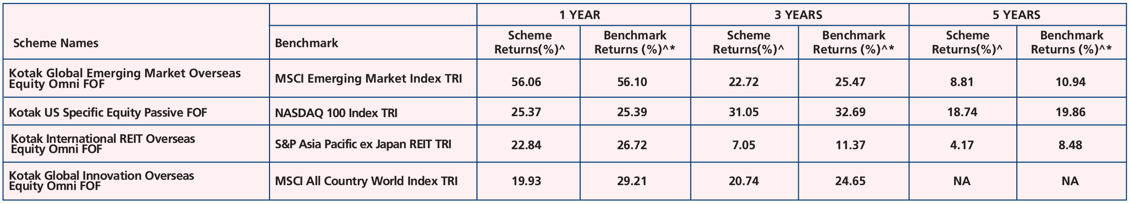 (Mar. 25, ’11), Kotak Multi Asset Omni FOF (Aug. 09, ’04), Kotak Gold ETF (Jul. 27, ’07), Kotak Balanced Advantage Fund (Aug. 03' 18), Kotak US Specific Equity Passive FOF (Feb. 02' 21), Kotak Multicap Fund (Sep. 29'21), Kotak NIFTY Alpha
