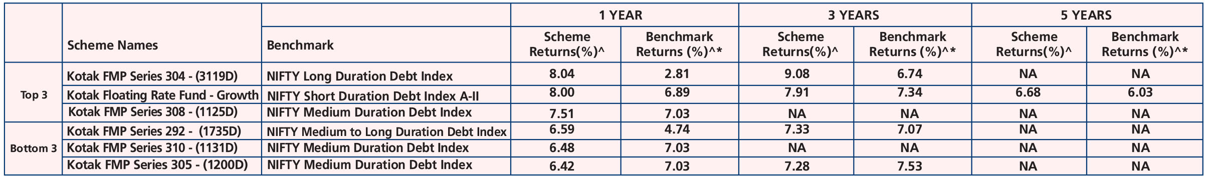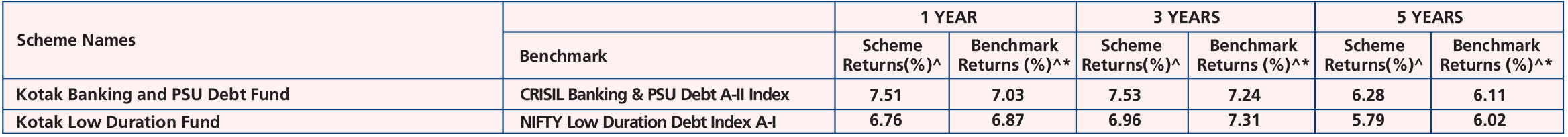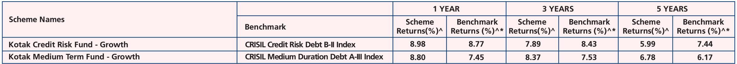 Fund (Dec. 29, ’98), Kotak Savings Fund (Aug. 13, ’04), Kotak Credit Risk Fund (May 11, '10), Kotak Medium Term Fund (Mar. 21, ’14), Kotak Low Duration Fund (Mar. 06, ’08), Kotak Corporate
