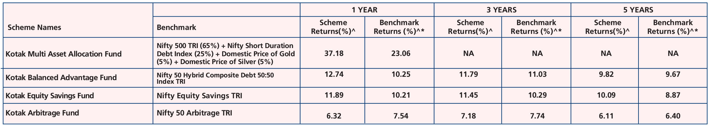 Kotak Multi Asset Allocation Fund - Growth, *Name of the Benchmark - NIFTY 500 TRI (65%) + NIFTY Short Duration Debt Index (25%) + Domestic Price of Gold (5%) + Domestic Price of Silver (5%). Scheme Inception date is 22/09/2023.