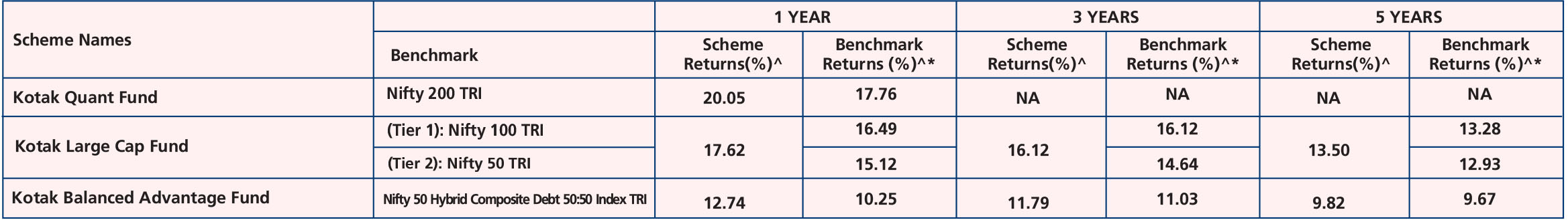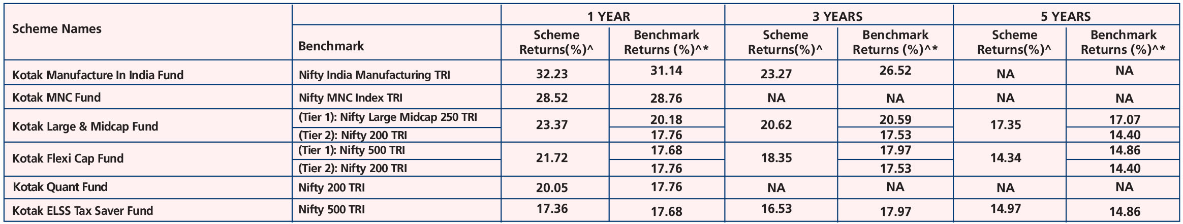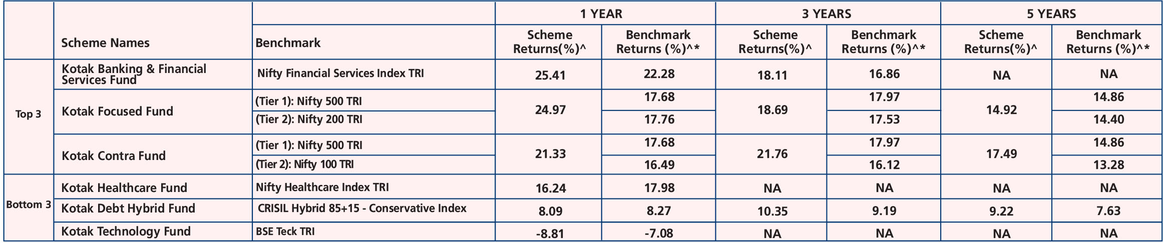 Kotak ELSS Tax Saver Fund (Nov. 23,'05), Kotak Large & Midcap Fund (Sep 9, ‘04), Kotak Flexicap Fund (Sep 11, ‘09), Kotak Manufacture in India Fund (Feb. 22,'22), Kotak Quant Fund (Aug. 2,'23), Kotak MNC Fund (Oct. 28,'24)