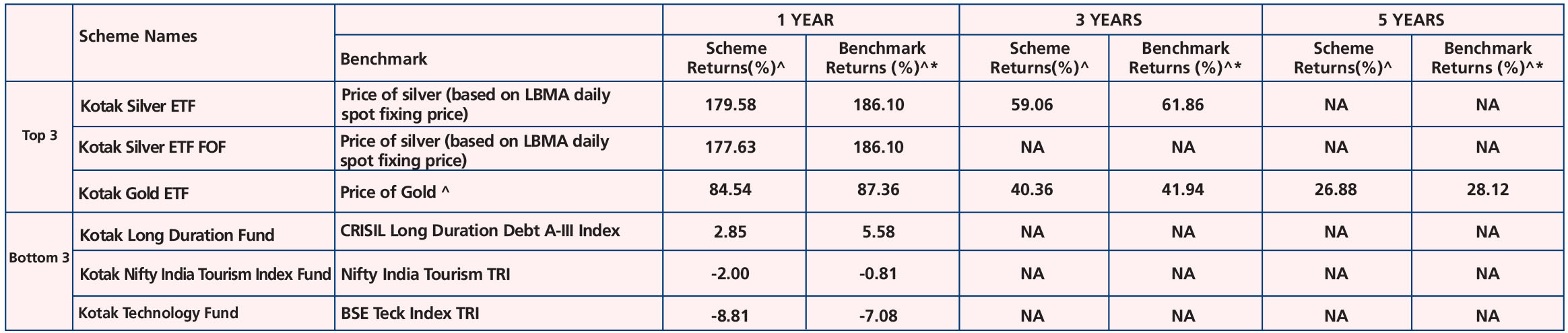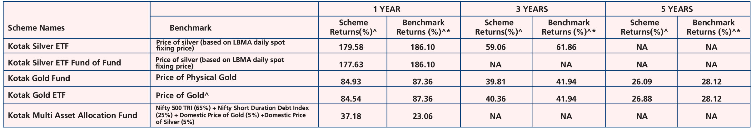 Kotak Gold ETF (Jul. 27, ’07), Kotak Gold Fund (Mar. 25, ’11), Kotak Silver ETF (Dec. 09, ’22), Kotak Silver ETF Fund Of Fund (Mar. 31, ‘23) & Kotak Multi Asset Allocation Fund (Sep. 22, ‘23).