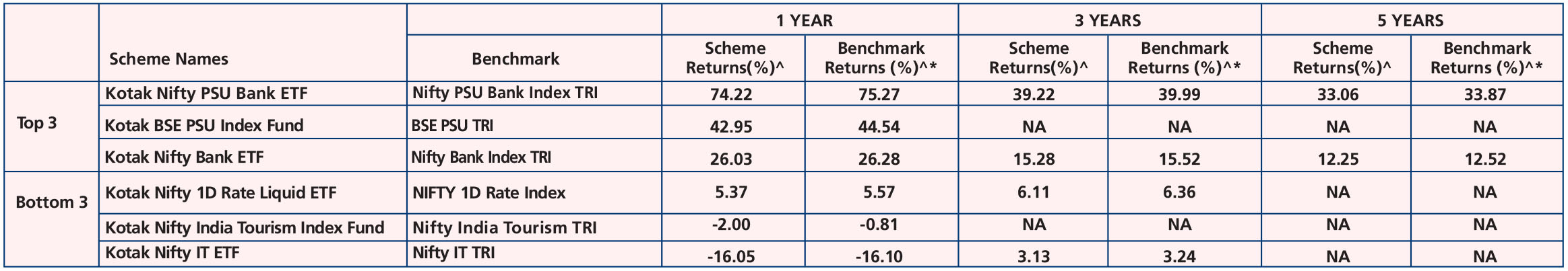 Kotak Nifty PSU Bank ETF , *Name of the Benchmark - Nifty PSU Bank Index TRI, Scheme Inception date is 08/11/2007. Mr. Devender Singhal & Mr. Satish Dondapati has been managing the fund since 09/05/2019.