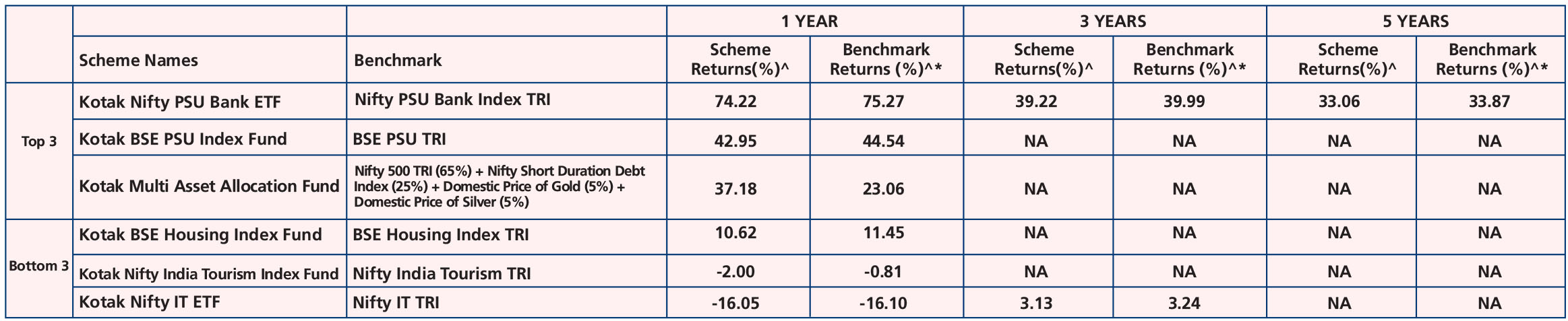 Kotak Nifty 50 Value 20 ETF (Dec. 02, '15), Kotak Nifty Bank ETF (Dec. 04, '14), Kotak Multi Asset Omni FOF (Aug,. 09, '04), Kotak Nifty PSU Bank ETF (Nov. 08, 07), Kotak Nifty 50 ETF (Feb. 02,