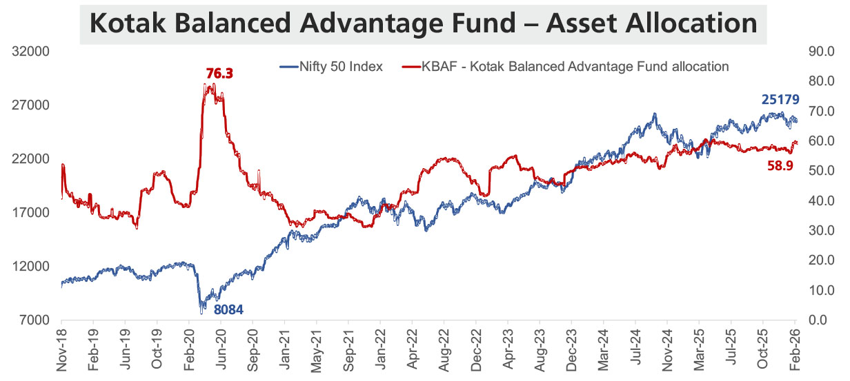 Source: KMAMC Internal Analysis. As on 27 February 2026. Disclaimer: The Nifty 50 Index exposure is considered to explain the equity valuations as category in comparison to KBAF Allocation. | KBAF - Kotak Balanced Advantage Fund. Nifty 50 Index represents the Market which is 50% component of the Benchmark – Nifty 50 Hybrid Composite Debt 50:50 Index.